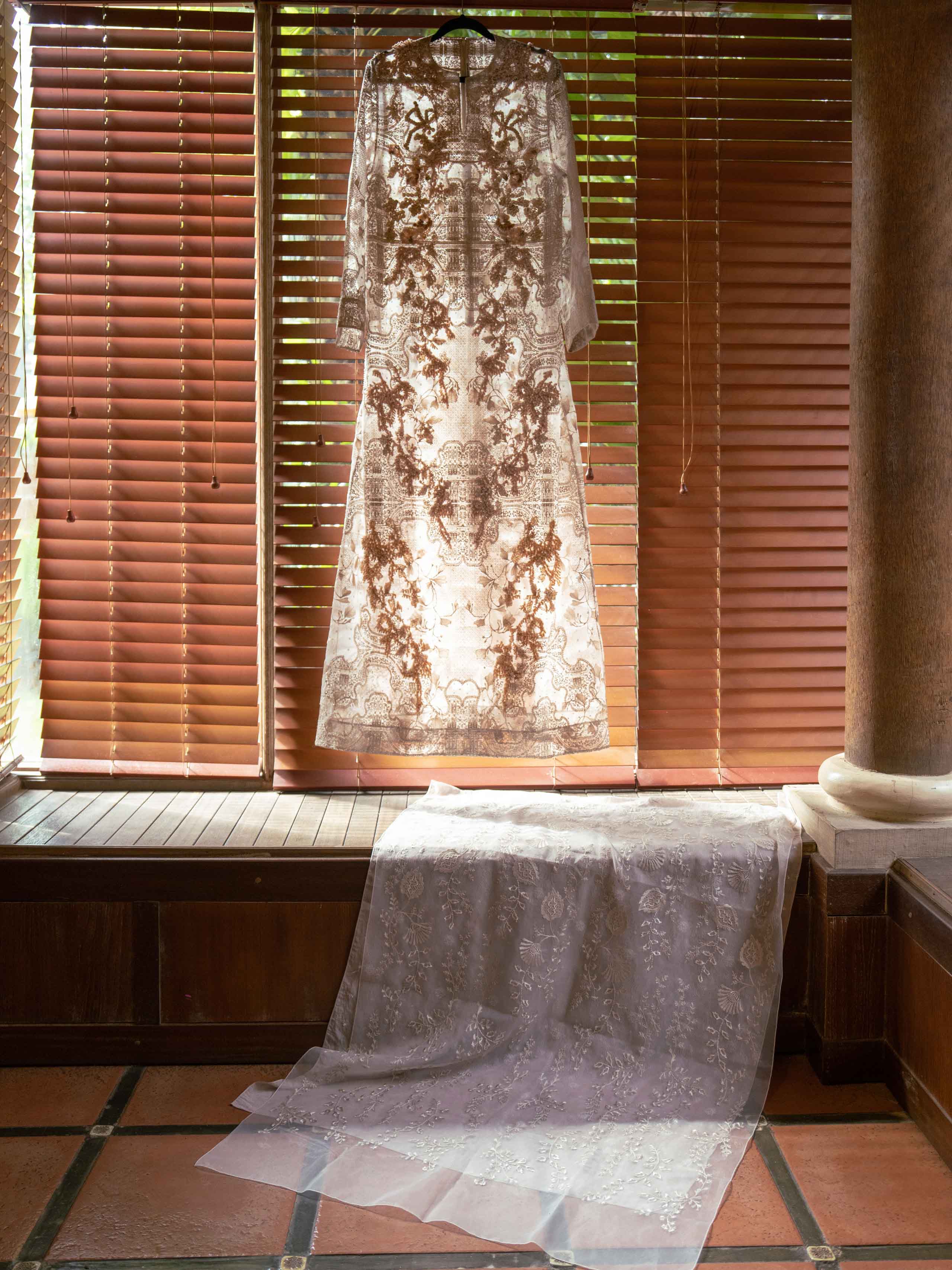 Crafted in delicate organza, the long dress is defined by an elegant H line silhouette, framed by SAPTOJO Pattern Yayi and Rikmadara embroideries arranged with precision and sensitivity. Subtle Reben embellishments enrich the surface with depth and luminosity, allowing light and movement to become part of the design language. Each detail reflects a thoughtful balance between structure and softness.