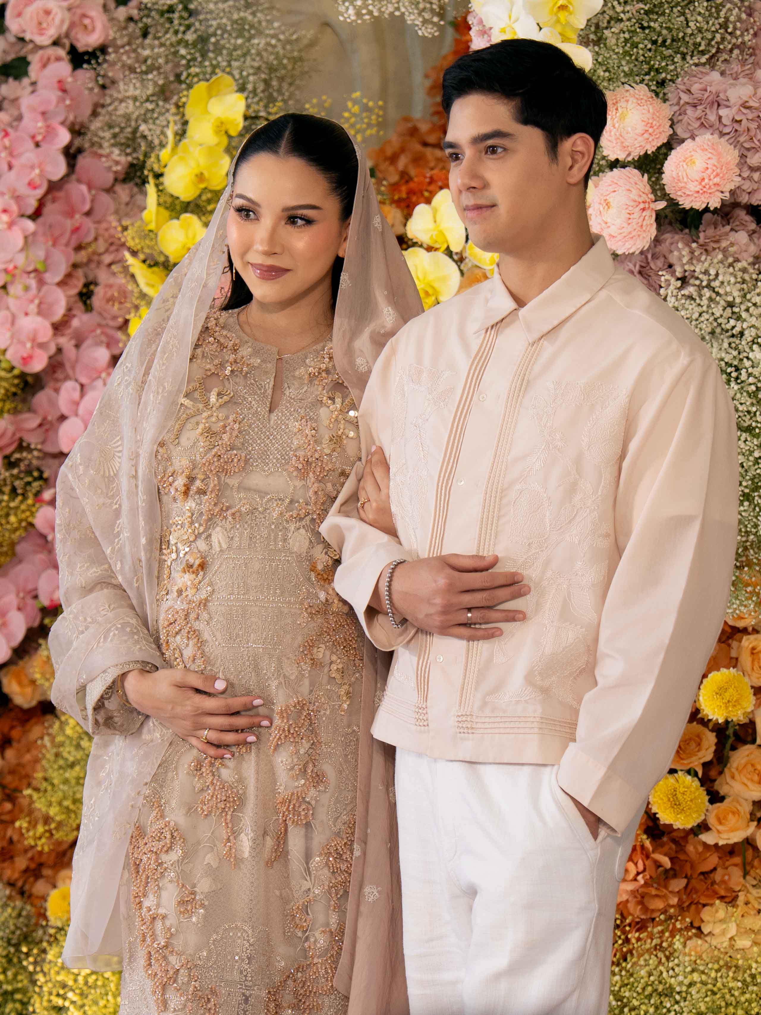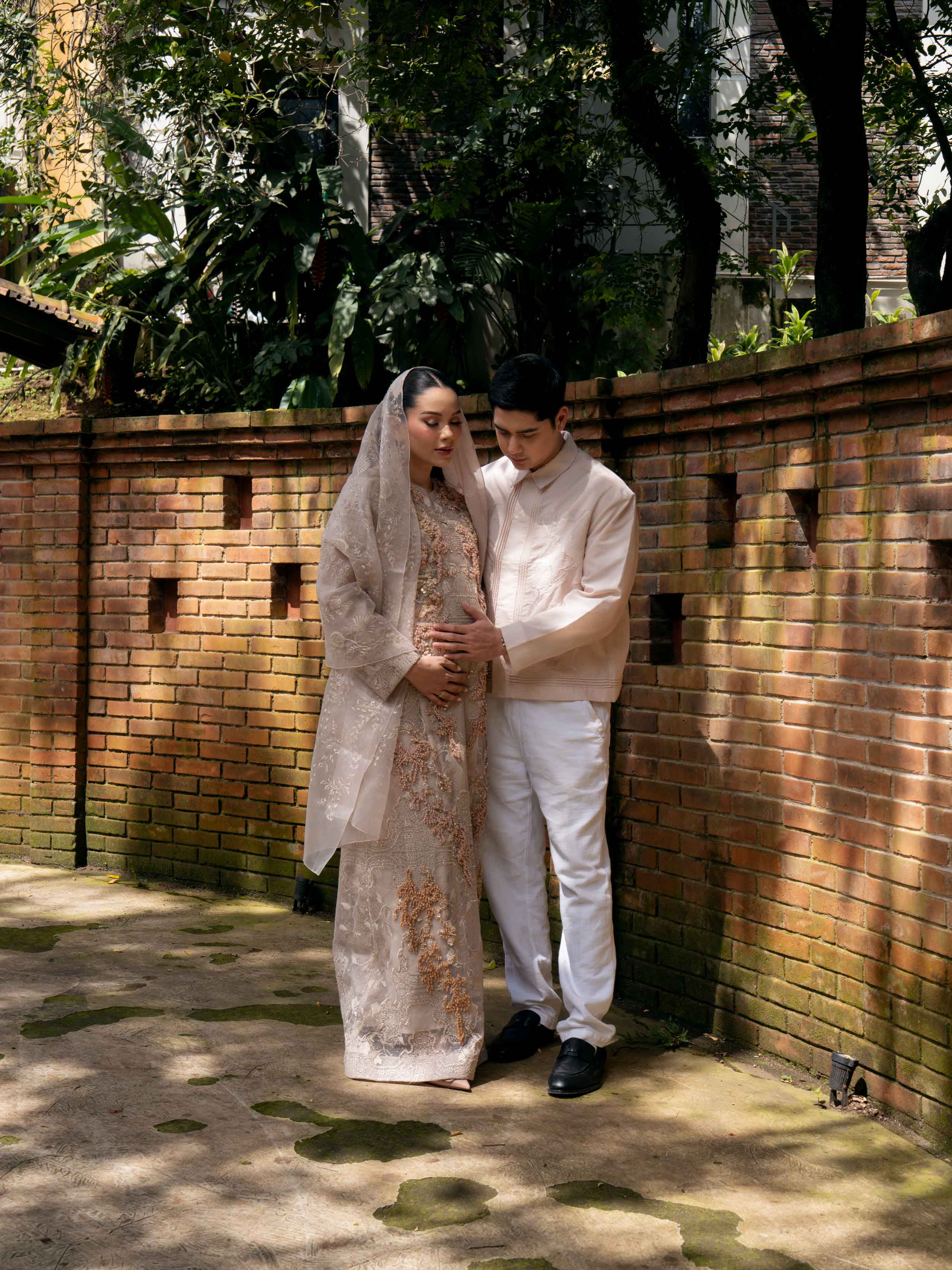 Her husband, Al Ghazali, appeared in a long sleeved shirt rendered in a soft Blush tone, detailed with SAPTOJO Pattern Noni stitched appliqué. The subtle interplay of color and craftsmanship lends his look an understated elegance, balancing ease with considered detail.